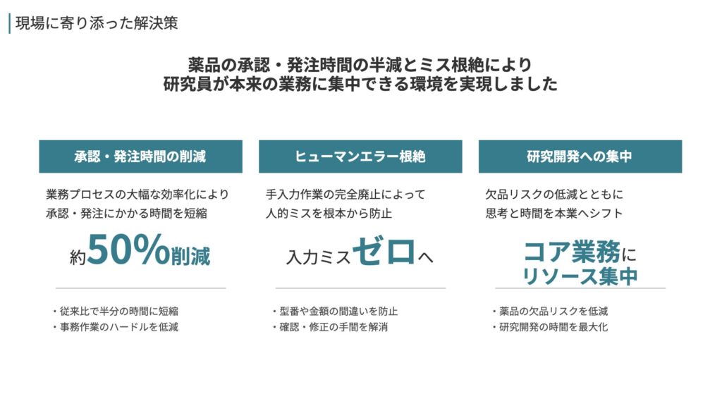 日々、実験を繰り返す中で薬品が底をつくたびに発生する、上長への発注承認メール。一つひとつは数分の作業でも、部署全体で月に何度も繰り返されると、それはバカにできない「見えないコスト」となって現場を圧迫します。