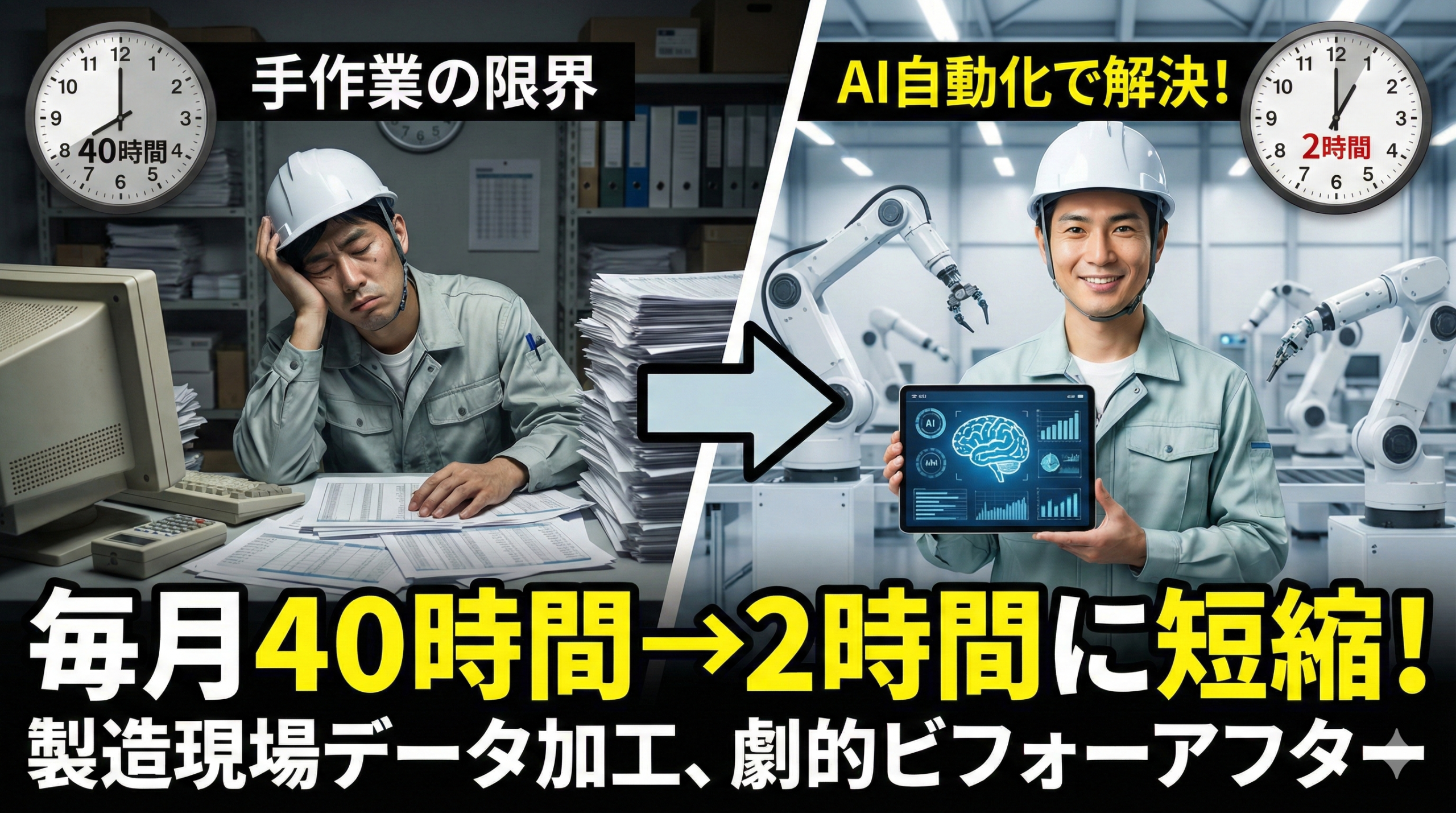 私は製造現場のDX支援を行っているのですが、そこで直面したのが大量のCSVファイルの定型加工業務です。工場の機械から出力される膨大なデータを、報告用に一つずつ仕分け、計算し、フォーマットを整える作業。一つひとつの操作は単純でも、ミスが許されないため集中力が必要で、これまではこの作業だけで毎月40時間もの時間を費やすのが当たり前でした。